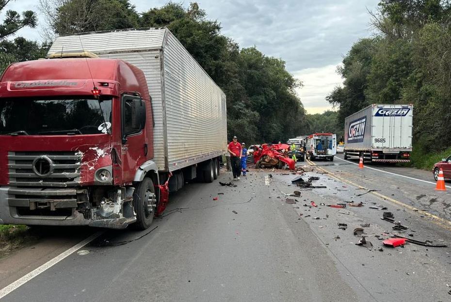 Duas pessoas morreram e uma ficou gravemente ferida em um acidente envolvendo um caminhão guincho, uma carreta e um carro na BR-277, em Virmond, na região central do Paraná, na manhã desta quarta-feira (26).