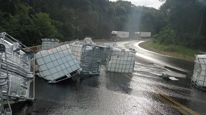 O veículo tombou na terça-feira (30), em uma curva na altura do km 482, entre o município e Guaraniaçu. Com a queda de 16 bombonas, cada uma com 1.000 litros, houve vazamento de monoetalonamina, produto "perigoso", segundo o Corpo de Bombeiros. O volume total derramado no local não foi confirmado.