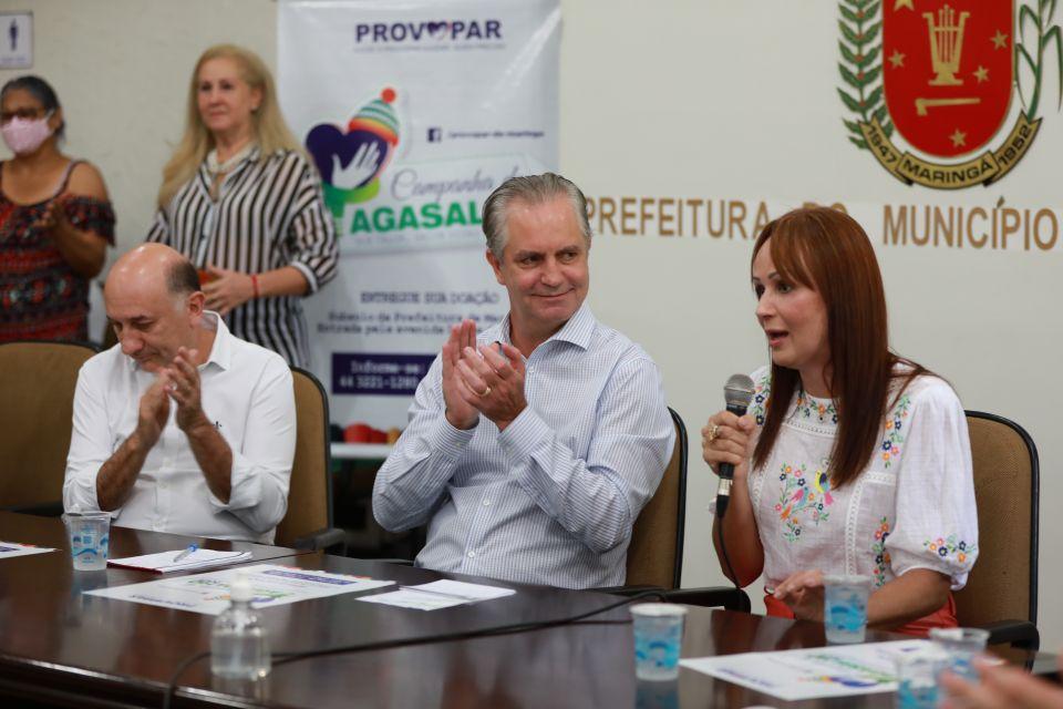A Campanha do Agasalho 2022 “Doe Calor, Salve Vidas”, promovida pelo Provopar com apoio da Prefeitura de Maringá, foi lançada nesta quarta-feira (27). Durante o evento, o prefeito Ulisses Maia entregou à presidente do Provopar, Eliane Maia, os convites do show de Luan Santana, que acontece na Expoingá no dia 9 de maio com portões abertos, sem custos para a população. A entrada será um quilo de alimento não perecível.