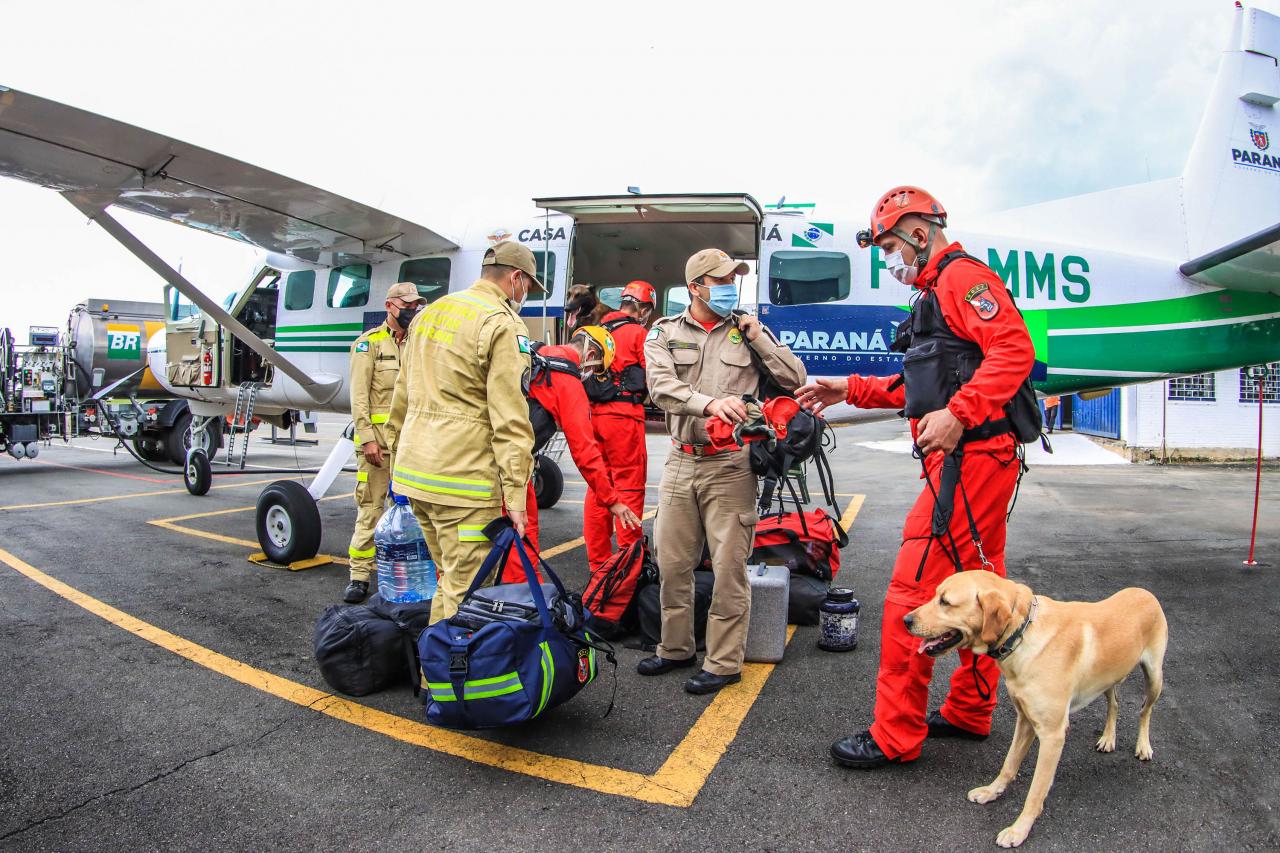PARTIDA - O envio das equipes aconteceu via terrestre e aérea. Na manhã deste sábado, três veículos saíram em direção ao estado do Rio de Janeiro levando seis bombeiros e dois cães. À tarde, às 16h55, quatro militares e dois cães se deslocaram por avião da Casa Militar da Governadoria para agilizar a chegada ao estado fluminense.