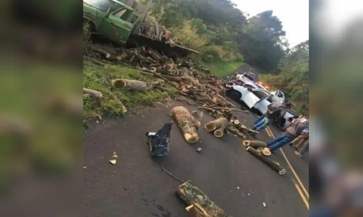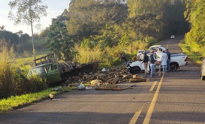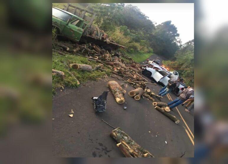 A batida foi muito forte. A caminhonete ficou destruída e toras de madeira ficaram espalhadas pela rodovia. A colisão aconteceu por volta das 7h.