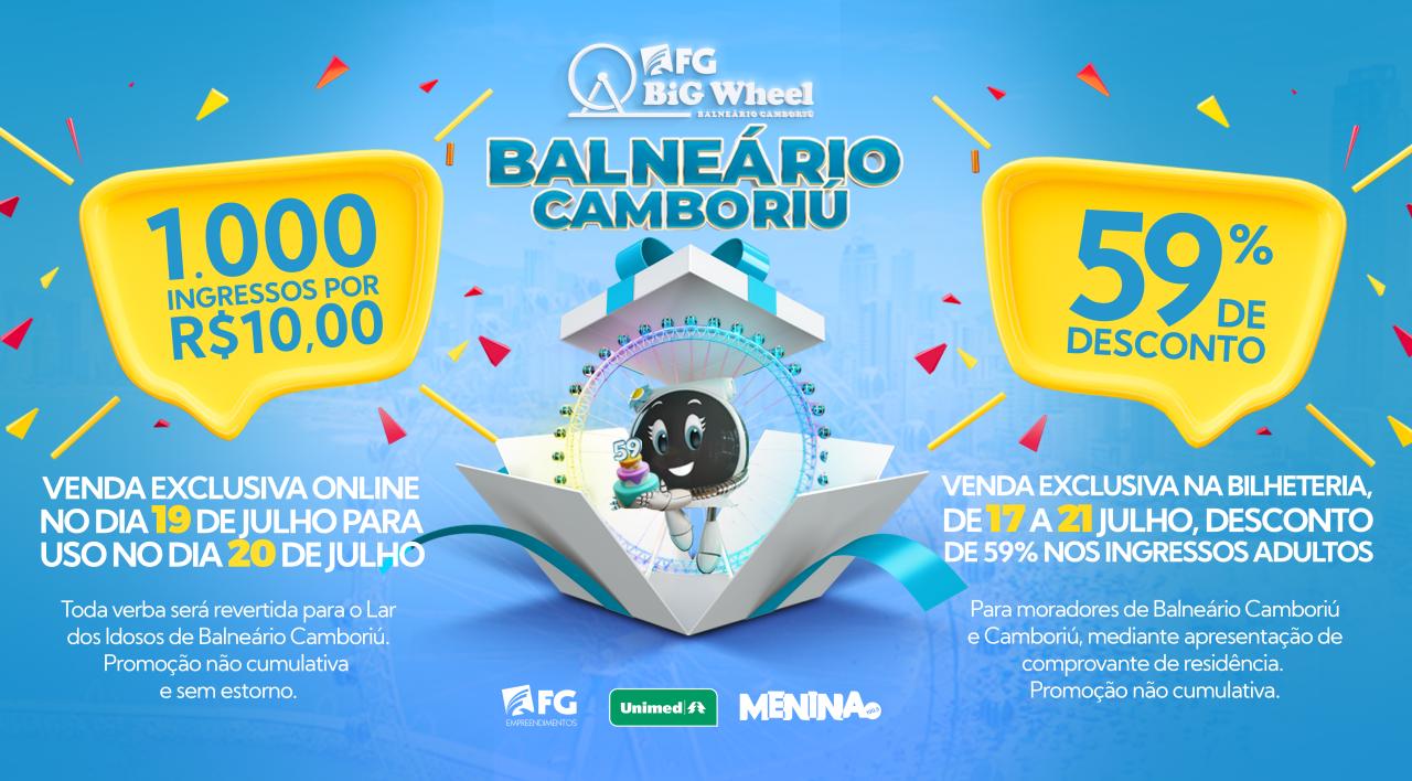 A FG Big Wheel começa a semana comemorando o aniversário de 59 anos de Balneário Camboriú (SC). A partir desta segunda dia 17, até sexta, 21, moradores da cidade e também de Camboriú ganham 59% de desconto no valor do ingresso adulto. A venda é exclusiva na bilheteria, com um comprovante de residência.