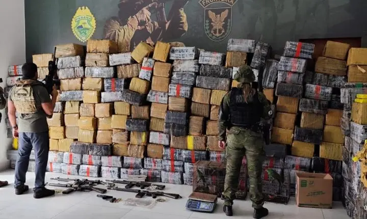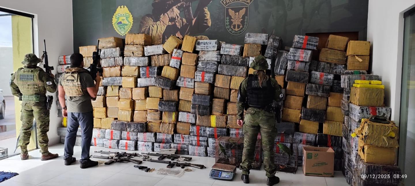 ICARAÍMA (PR) – Uma grande ofensiva contra o crime organizado na fronteira resultou em um prejuízo milionário ao tráfico de drogas nesta terça-feira, 09 de dezembro de 2025. Durante a Operação Protetor das Fronteiras e Divisas, forças de segurança interceptaram um carregamento de mais de 3,5 toneladas de maconha e um arsenal de grosso calibre no município de Icaraíma, Noroeste do Paraná.