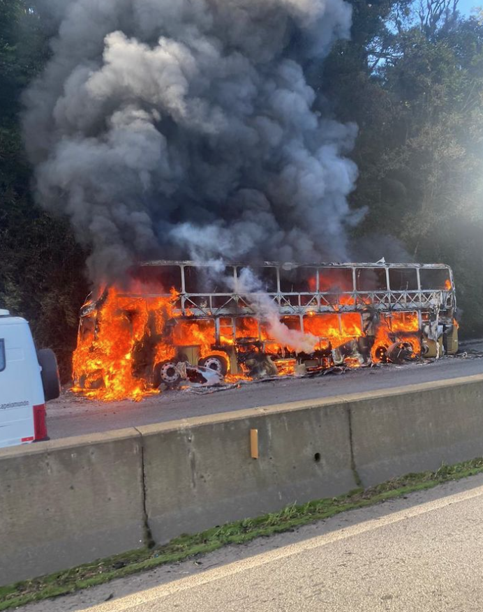 Serra do mar Morretes km 47 um ônibus pegou fogo ficou totalmente destruído, sentido Curitiba, tráfego lento na região, ainda sem informações se tinha passageiros ou vítimas feridas.