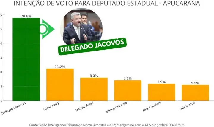 Uma pesquisa de intenção de voto realizada pelo Instituto Visão e divulgada pelo site Tribuna TN Online revelou um cenário de ampla liderança para o deputado estadual Delegado Jacovós na disputa por uma vaga na Assembleia Legislativa em 2026, no município de Apucarana.