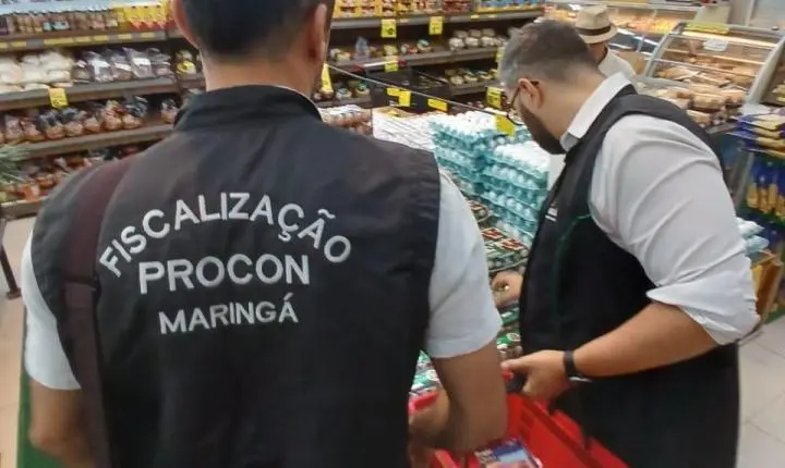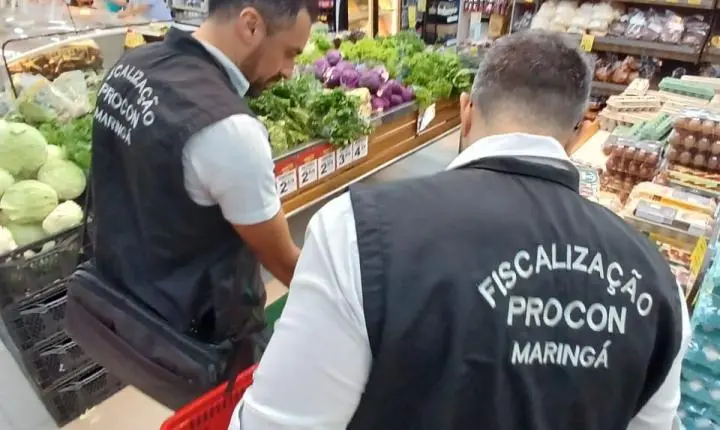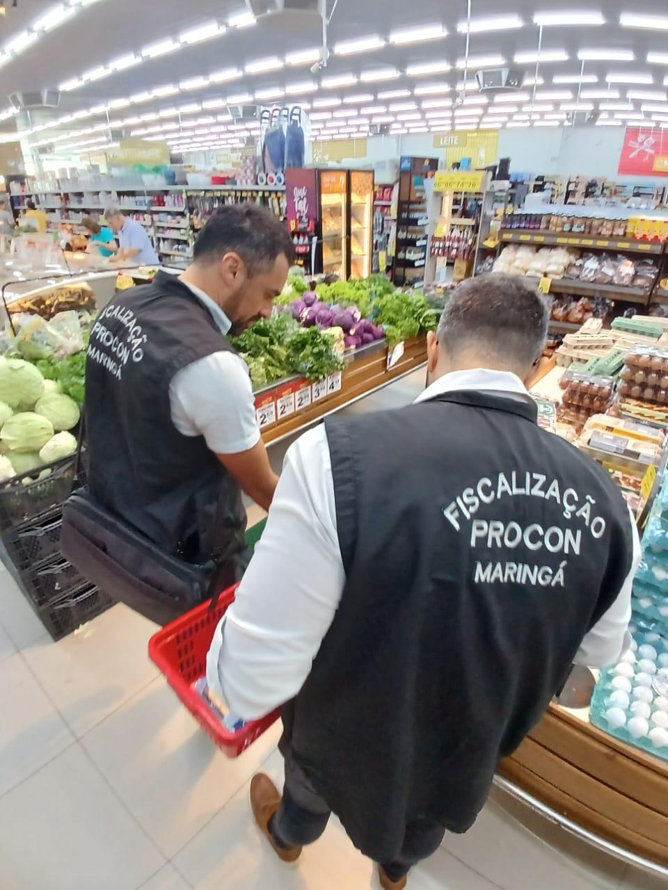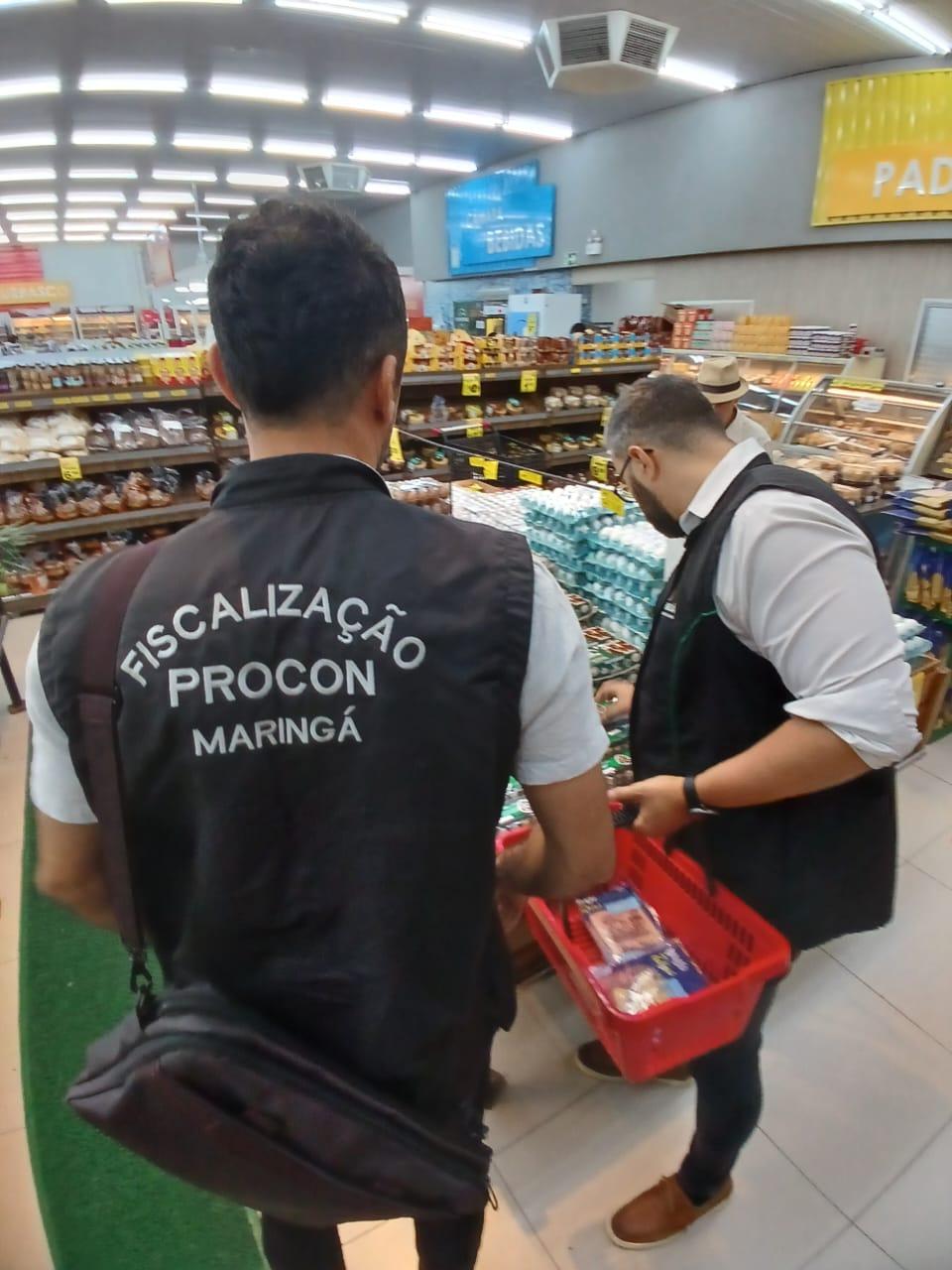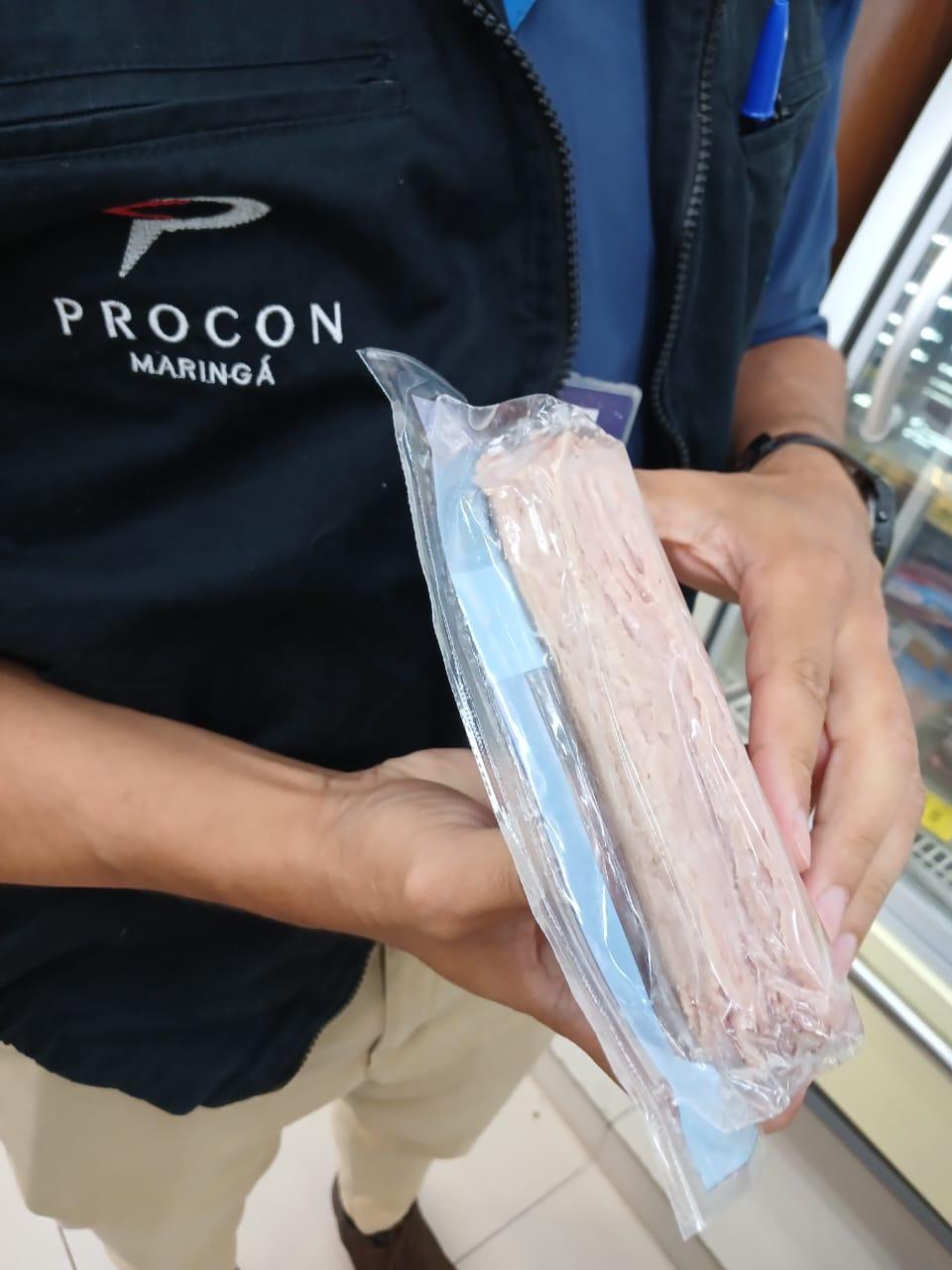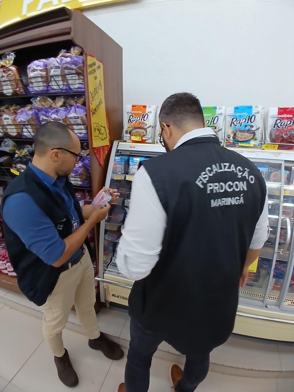 O Procon, da Prefeitura de Maringá, flagrou na manhã de hoje (8) alimentos irregulares num supermercado no Jardim Higienópolis. A vistoria atendeu uma denúncia de um consumidor que haveria produtos estragados e com bolor. A equipe do órgão de defesa do consumidor foi até o local e verificou sete embalagens com mercadorias que estavam com data de validade vencida, sem vácuo e inadequados para o consumo, entre outros. Foram apreendidos e com orientação para descarte imediato quase 5 quilos de alimentos como presunto, queijo, linguiça e mortadela.