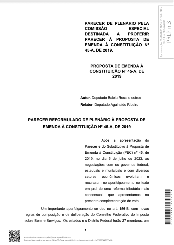 O texto é um substitutivo às Pecs 45 e 110, que tramitaram no Congresso e foram alvo de discussões no Grupo de Trabalho (GT) da Reforma Tributária da Câmara.