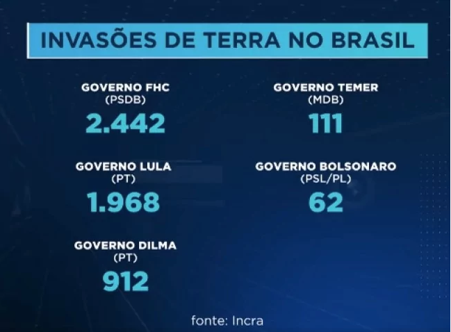 O maior número de invasões de terra no Brasil se deu durante o governo de Fernando Henrique Cardoso (PSDB), segundo dados do Incra. Foram 2.442 ocupações ilegais. Na gestão de Lula (PT), o montante caiu para 1.968, mas, ainda assim era grande. Já com Dilma no comando, o MST ocupou 912 áreas. Com Michel Temer (MDB), esse montante despencou para 111 e no Governo de Jair Bolsonaro (PL), houve apenas 62 invasões; porque o atual presidente preferiu entregar os títulos das terras aos assentados. Assim, eles ficam livres para solicitar crédito e empréstimo nos bancos federais ou mesmo vender a propriedade, se quiserem.