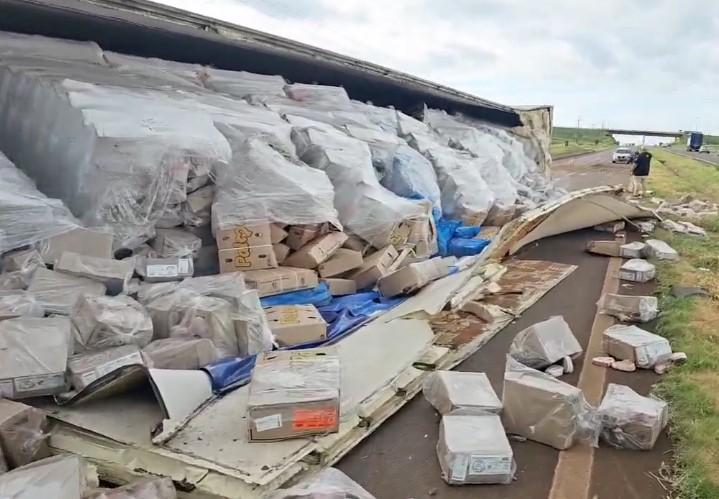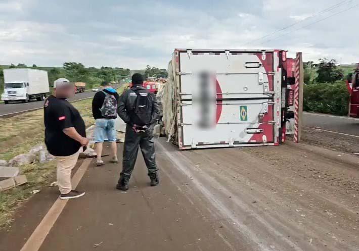 O trânsito ficou bastante congestionado nesta manhã de quarta-feira (27) na região do anel viário de Campo Mourão, Paraná, onde segundo informações, uma carreta que transportava frangos congelados veio a tombar logo após uma curva.