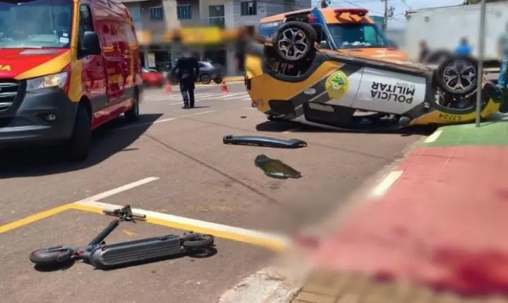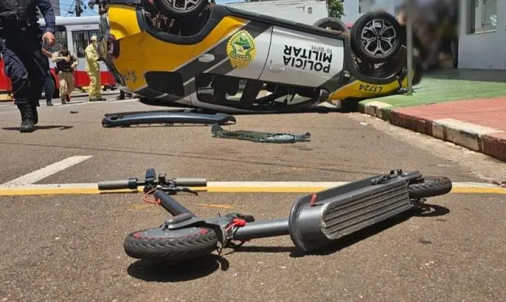 TOLEDO - Um acidente de proporções dramáticas e com sérias consequências chocou a população do Centro de Toledo no final da manhã desta sexta-feira (24). Uma viatura da Polícia Militar (PM) capotou após uma colisão e, descontrolada, atingiu violentamente um jovem que trafegava em um patinete elétrico. A vítima, um rapaz de aproximadamente 20 anos, foi socorrida em estado grave, com múltiplas fraturas e intenso sangramento, e luta pela vida.